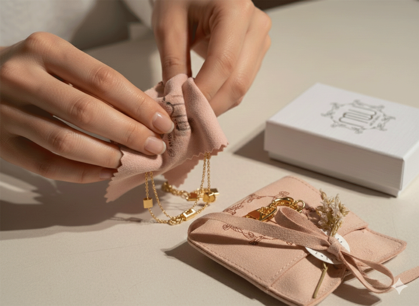 Wische deine Schmuckstücke regelmässig mit einem weichen, fusselfreien Tuch ab das entfernt Schmutz, Hautöle und Fingerabdrücke.