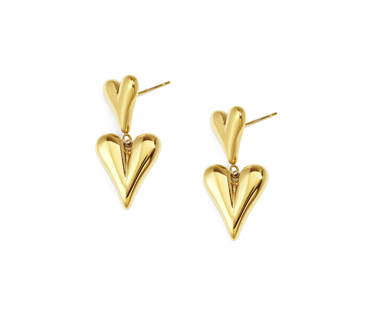 Doppeltes Herz, doppelter Style. Deine neuen Statement-Ohrringe. Vergiss klassische Herzchen diese Ohrringe definieren Romantik neu. Mit ihrer markanten, dreidimensionalen Puffy Optik und dem hochglanzpolierten Finish sind sie die perfekte Mischung aus verspieltem Charme und moderner Eleganz. Das obere Herz schmiegt sich als Stecker direkt ans Ohr, während das untere Herz bei jeder Bewegung sanft mitschwingt.