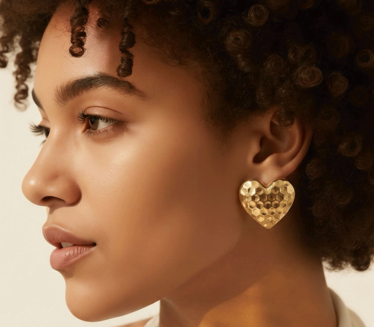 Verleihen Sie Ihrem Look ein Gefühl von Luxus und Herzlichkeit. Unsere Premium Ohrringe in Herzform sind weit mehr als nur ein Accessoire, sie sind ein Statement. Durch die kunstvoll gehämmerte Oberfläche fangen sie das Licht aus jedem Winkel ein und sorgen für einen dezenten, aber unverwechselbaren Schimmer auf Ihrer Haut.